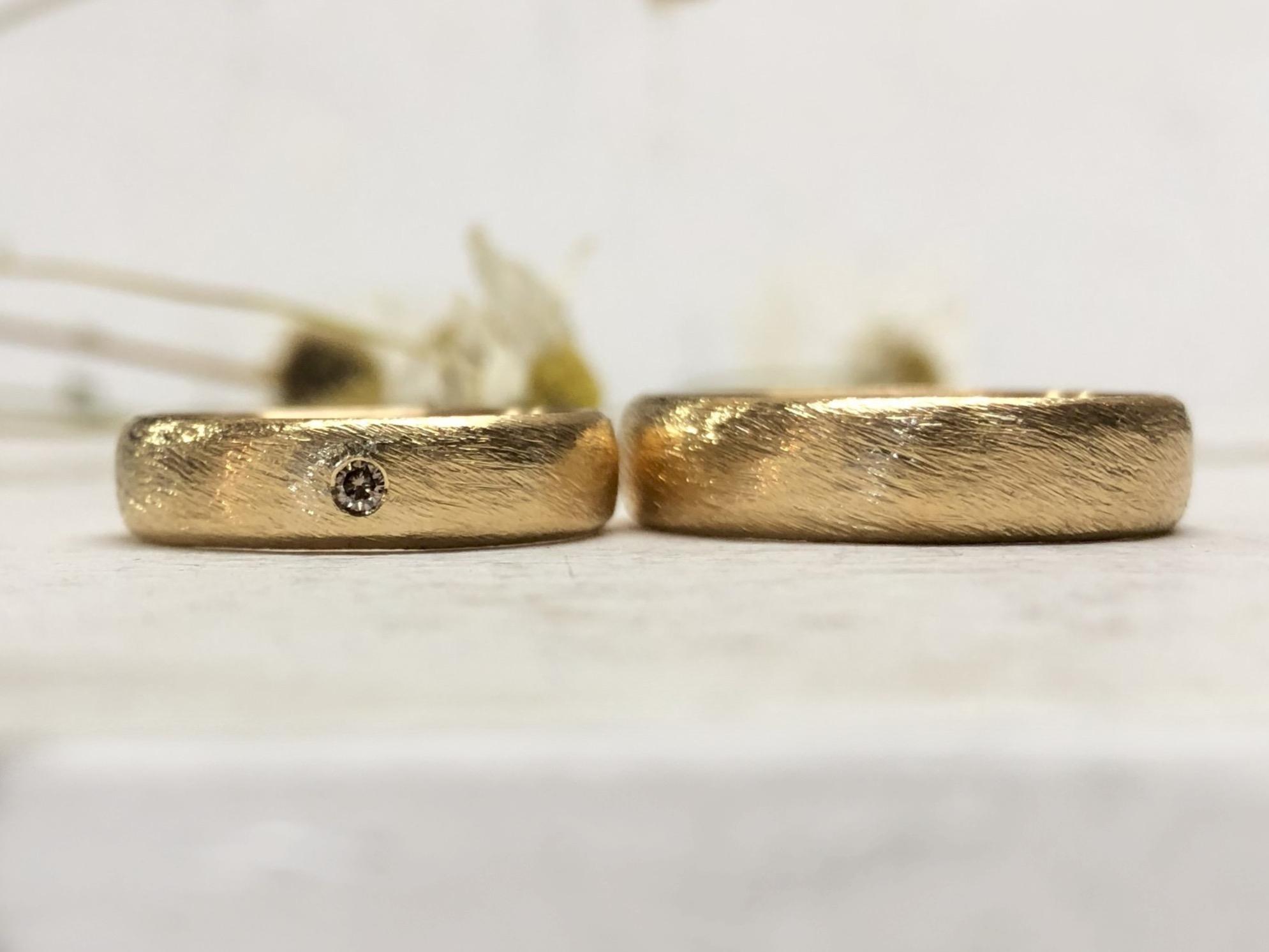 Die Ringe müssen nicht beide aus derselben Farbe und dem selben Feingehalt gefertigt werden. Die Ringe können aus je unterschiedlichem Goldgehalt/Farbe sein, beispielsweise Damenring 750 Gelbgold in Baumrindemuster und Herrenring 585 Graugold in Hammerschlagmuster.