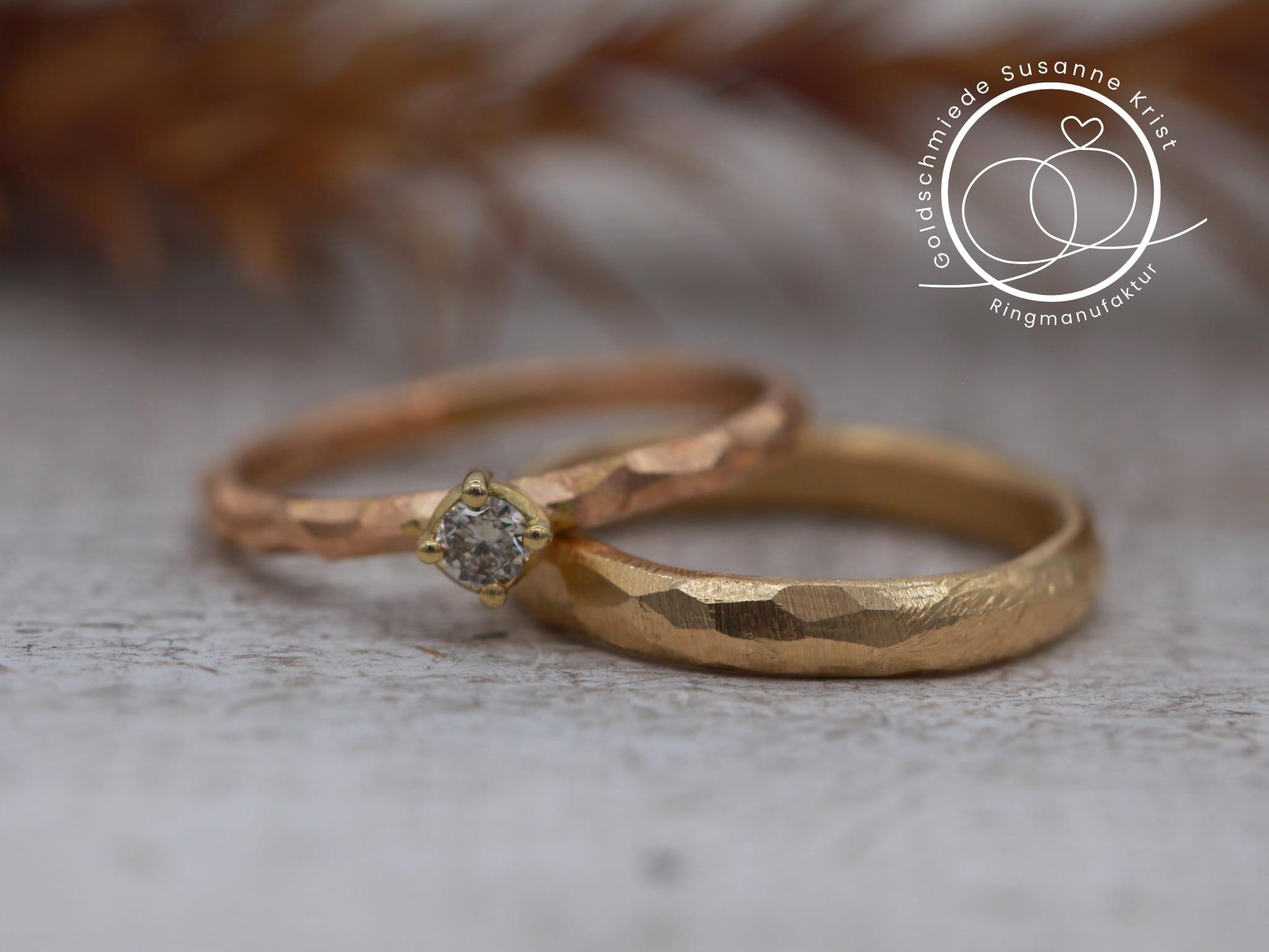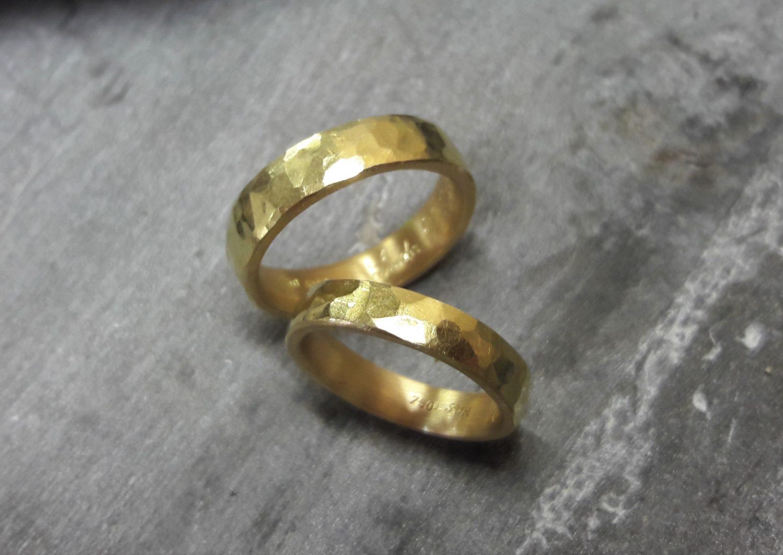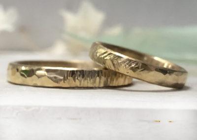 Facettierte Eheringe mit Hammerschlag Optik! Lebendige und natürliche Ausstrahlung.