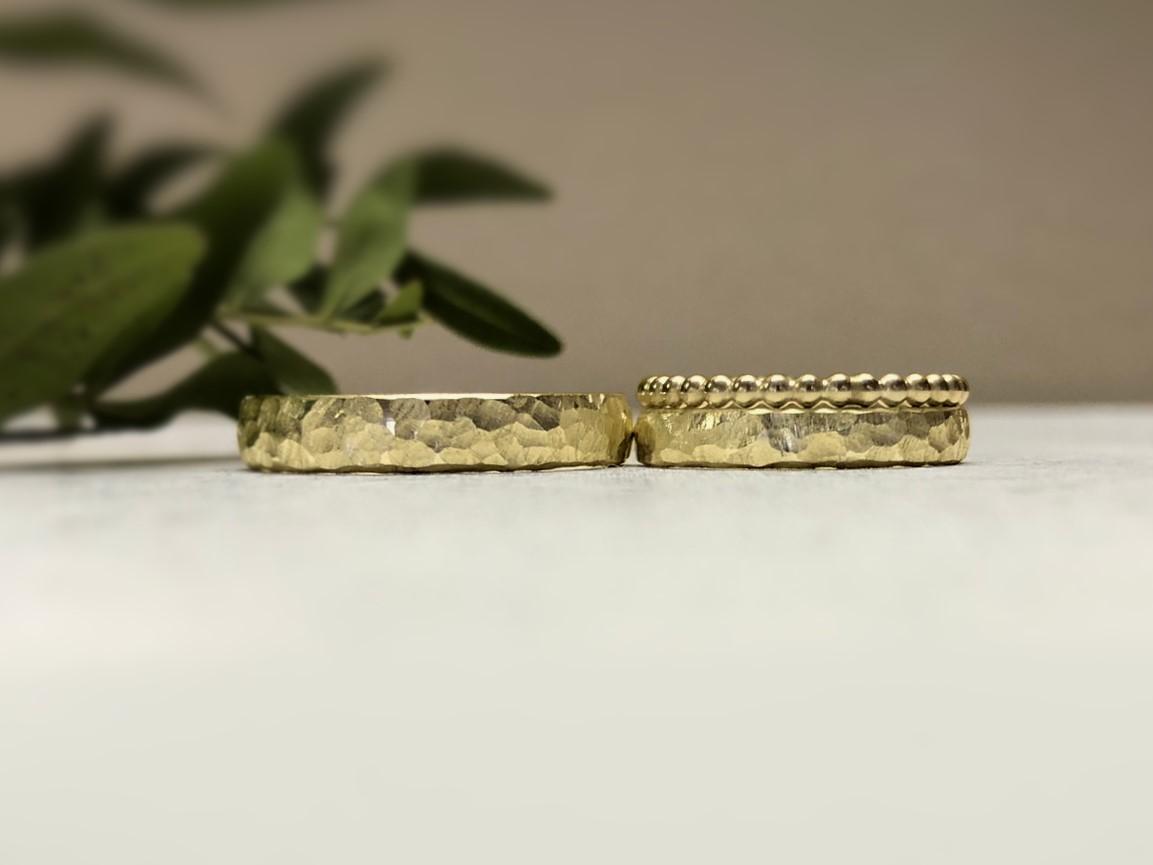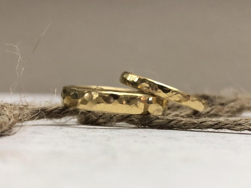 Mit verschiedenen Drehwerkzeugen wird jedes einzelne Grübchen bewusst platziert auf der Ringoberfläche. Jedes Grübchen hat eine ganz feine Maserung von den Werkzeugen. In den Grübchen fängt sich das Licht und so wirkt die Oberfläche sehr lebendig. Die Ringe haben also den coolen Hammerschlag Style, sind aber auf wartungsfreundliche Art und Weise gefertigt. Es ist also sehr wartungsfreundlich, für den Fall dass einmal eine Ringgrößenänderung oder eine Aufarbeitung am Ring gemacht wird.
